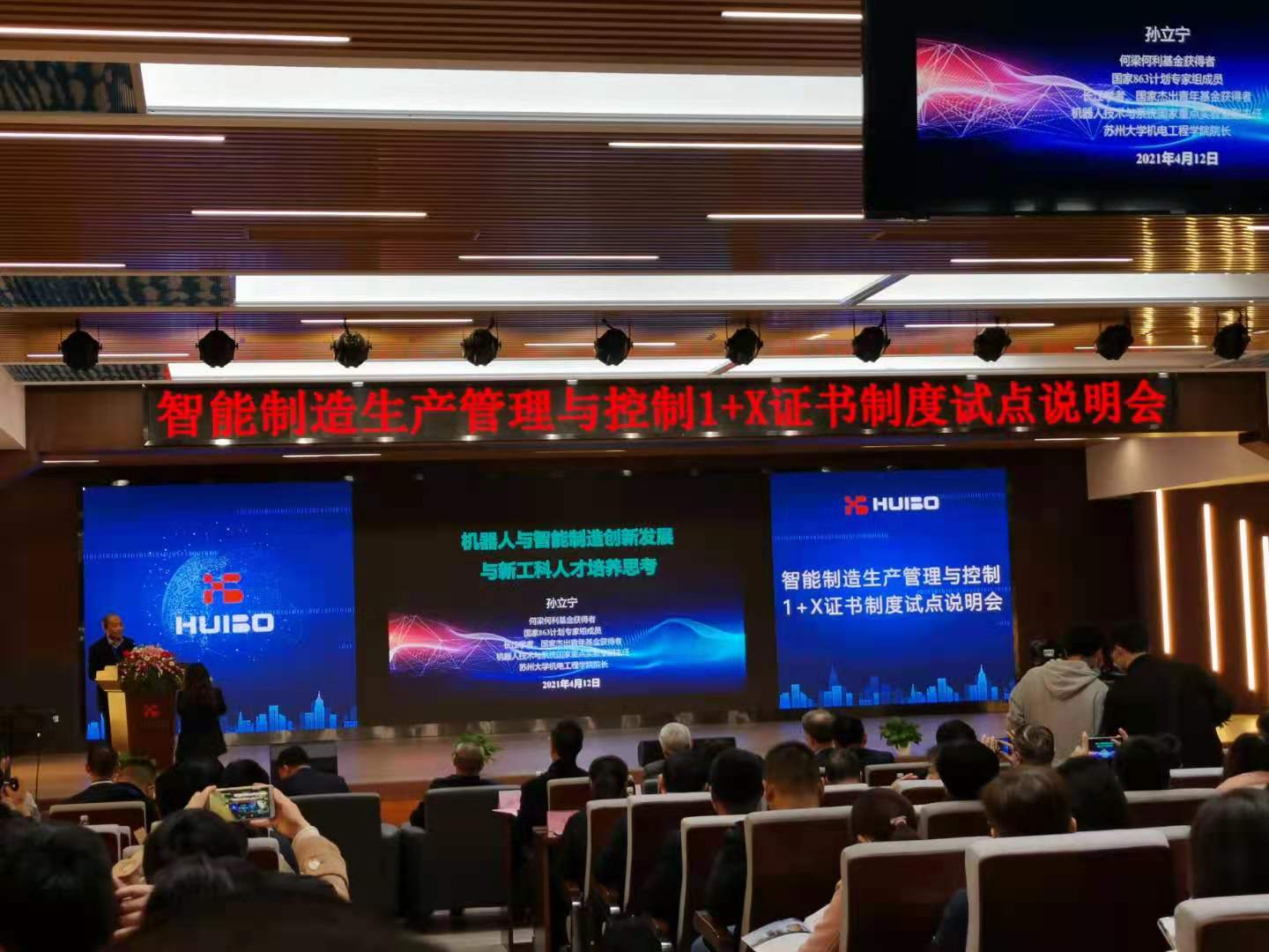 4月12日,智电学院院长刘国华与马艳梅、蒋军两位老师一起赴苏州参加江苏汇博机器人技术股份有限公司举办的教育部第四批“1+X”智能制造生产管理与控制证书试点说明会,并参观了汇博公司在智能制造领域的实验实训产品。【撰稿:蒋军 摄影:蒋军 审核:刘国华】