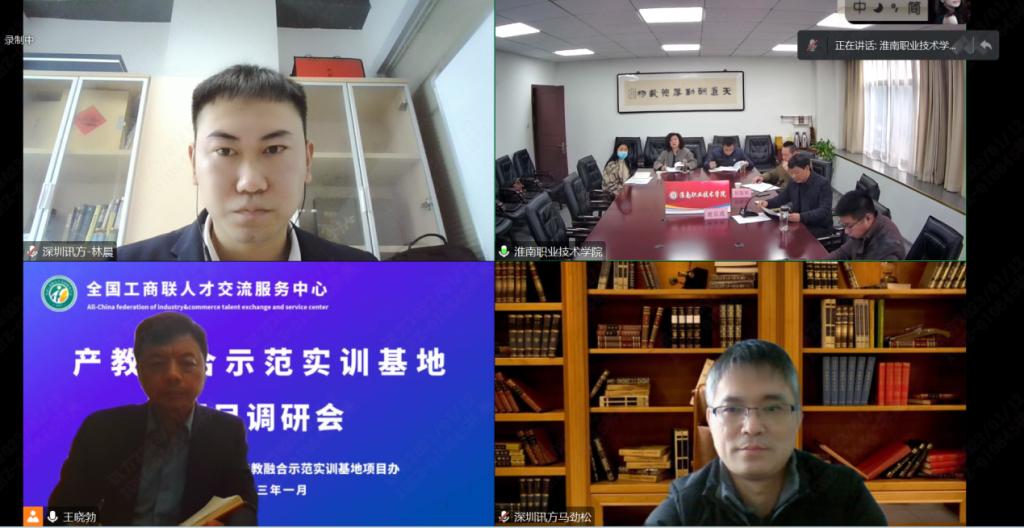 1月12日,美高梅申报的全国工商联人才中心产教融合示范实训基地线上调研会在行政楼307会议室举行。全国工商联人才中心产教融合工作负责人王晓勃、人才中心企业服务处郭伟,美高梅副校长凌总成、教务处曹琦、校企合作办杨翠兰、美高梅平台网站入口院长刘国华、美高梅平台网站入口主任秘书蒋军以及深圳市讯方技术股份有限公司校企合作中心总经理林晨、产品交付中心总经理马劲松、淮南运营中心运营经理王凡等相关人员参加了会议。