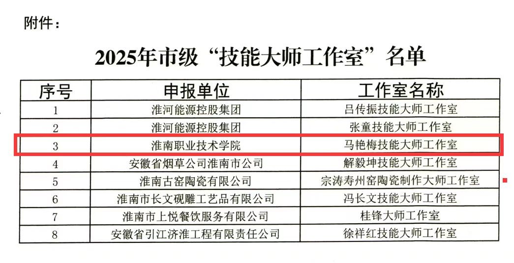 2025年10月16日,淮南市人力资源和社会保障局正式公布了2025年市级“技能大师工作室”认定名单,美高梅平台网站入口马艳梅老师主持的“马艳梅技能大师工作室”成功入选,标志着学院在高技能人才培养平台建设方面取得重要突破。