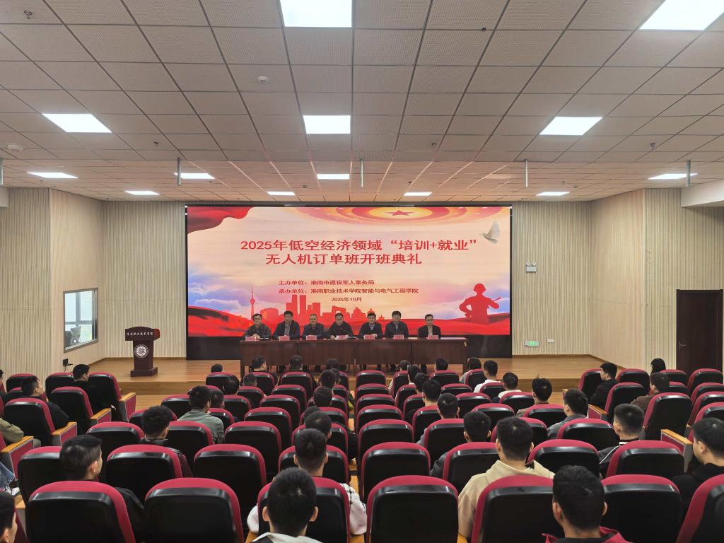 2025年10月24日15时,低空经济领域“培训+就业”无人机订单班开班仪式在淮南职业技术学院春申湖校区1号教学楼1307报告厅举行。淮南市退役军人事务局党组成员、副局长余涛,淮南职业技术学院副校长朱云辉出席仪式。淮南市退役军人事务局就业创业和军休服务管理科、淮南职业技术学院培训学院、美高梅平台网站入口、春申湖校区综合办相关负责人参加会议。会议由美高梅平台网站入口院长曹祺主持。