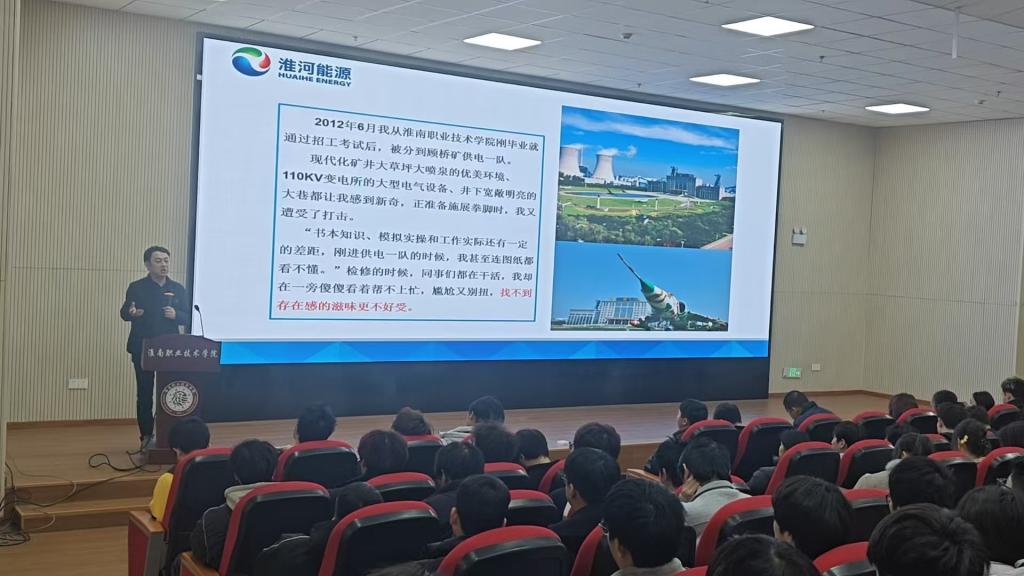 讲座现场,程晨结合自身从基层电工,成长为矿井供电系统技术专家的经历,分享了 “看、听、查、修、验” 维修五步法的实操技巧,以及带领团队排查100余起安全隐患、研发多项国家专利的创新故事。“当年在母校打下的电气理论基础,是我破解现场难题的‘金钥匙’。”他以 “高防开关双电源自动切换设计”为例,拆解了“把课堂知识转化为矿井安全生产力” 的实践路径,引发学生阵阵惊叹。