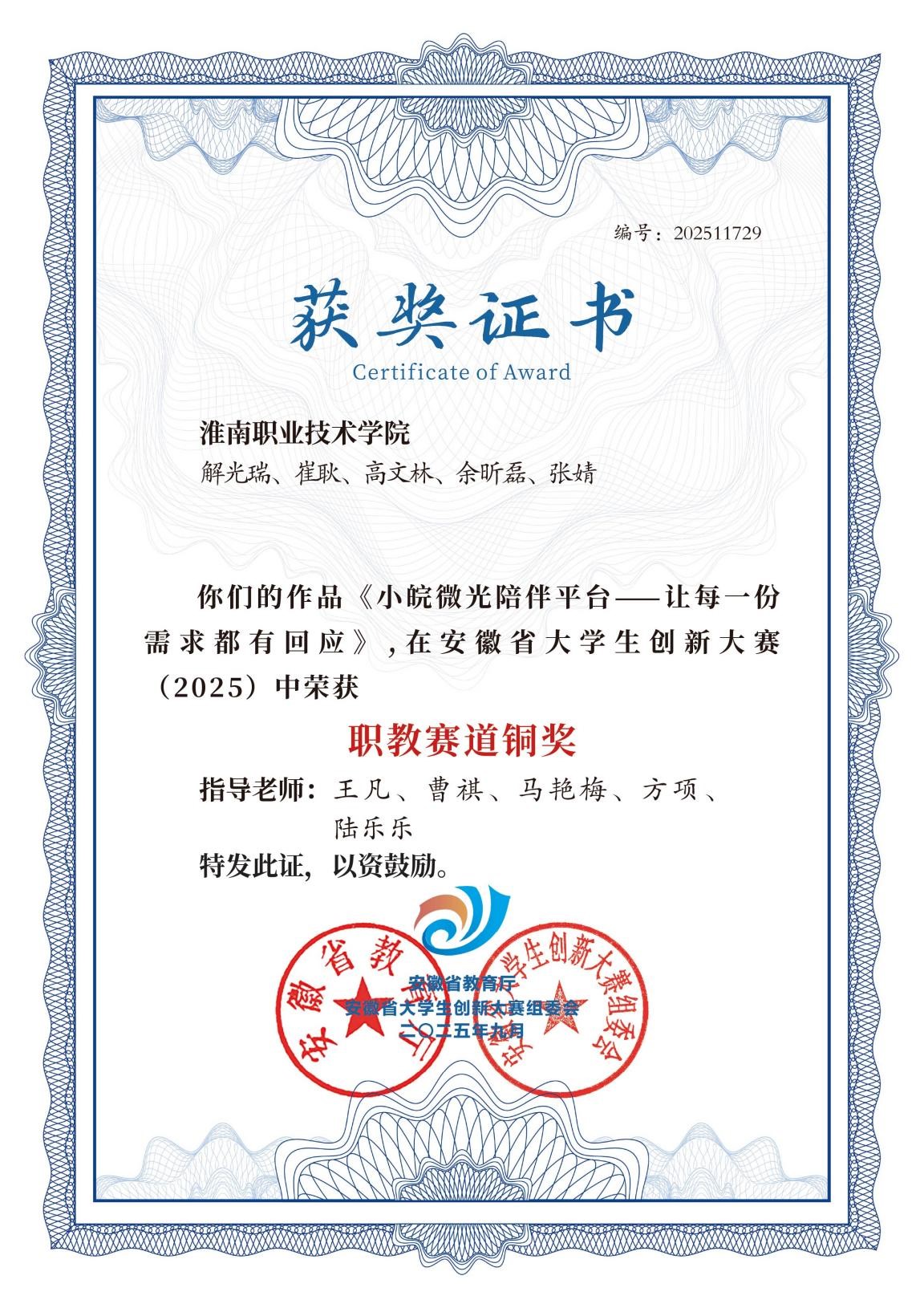 近日,安徽省大学生创新大赛圆满落幕,美高梅平台网站入口学子凭借扎实专业素养与出色实践能力,在大赛激烈竞争中脱颖而出,分别于职教赛道和产业赛道斩获铜奖。安徽省大学生创新大赛前身为安徽省“互联网+”大学生创新创业大赛,是由安徽省教育厅主导的年度性大型赛事,本届大赛吸引了19.8万个项目报名参赛,参赛人数达80万,旨在激发青年学生创新创造热情,提高学生的创新精神、创新意识和创新能力。